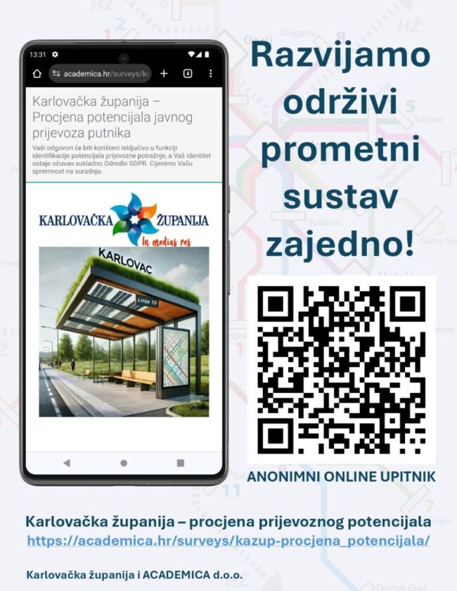 Sukladno sastancima održanim s predstavnicima gradova i općina Karlovačke županije, započelo je prikupljanje podataka za uspostavu novog sustava javnog linijskog prijevoza. Na internetskoj stranici Karlovačke županije objavljena je anketa za procjenu potencijala javnog prijevoza: Karlovačka županija radi na uspostavi novog sustava javnog prijevoza – ispunite anketu Građani su pozvani na sudjelovanje kako bi se osigurali…