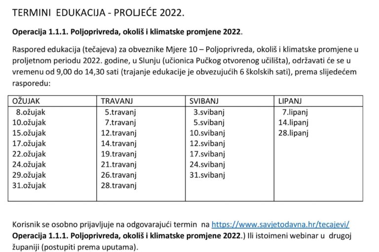 TERMINI EDUKACIJA – PROLJEĆE 2022. Operacija 1.1.1. Poljoprivreda, okoliš i…
